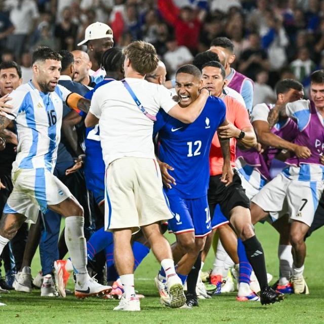 法国国奥在主场1比0淘汰阿根廷国奥,在本土奥运会上完成了对2022世界杯决赛,以及嘲讽法国球员的球迷歌曲的复仇。比赛结束后,一些法国球员来到阿根廷球员家属所在的看台前庆祝,并做出挑衅的手势,这样的举动马上引起了双方球员的冲突。